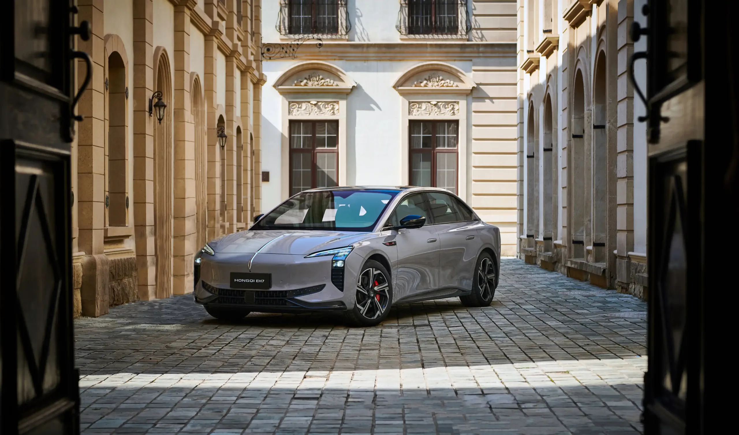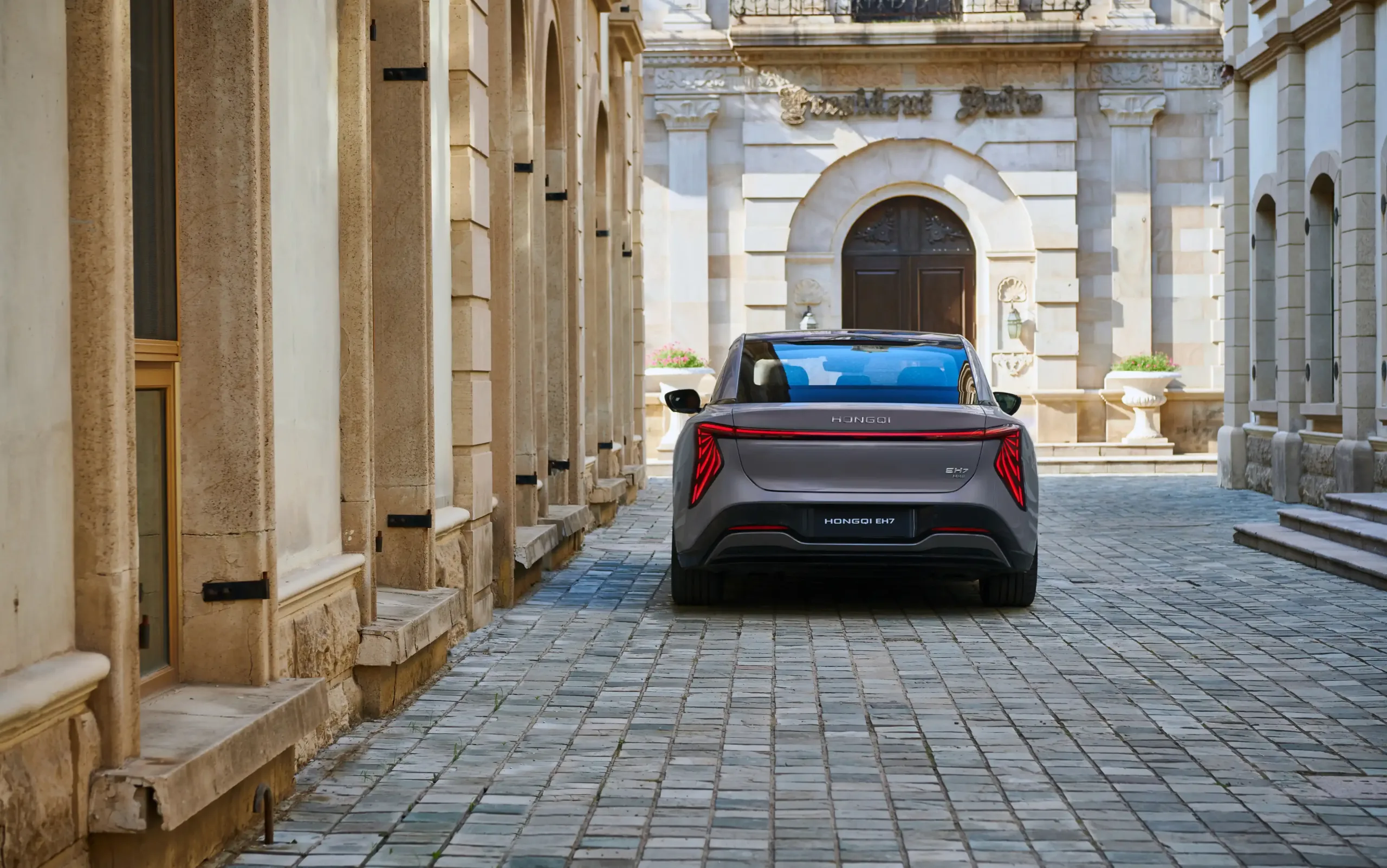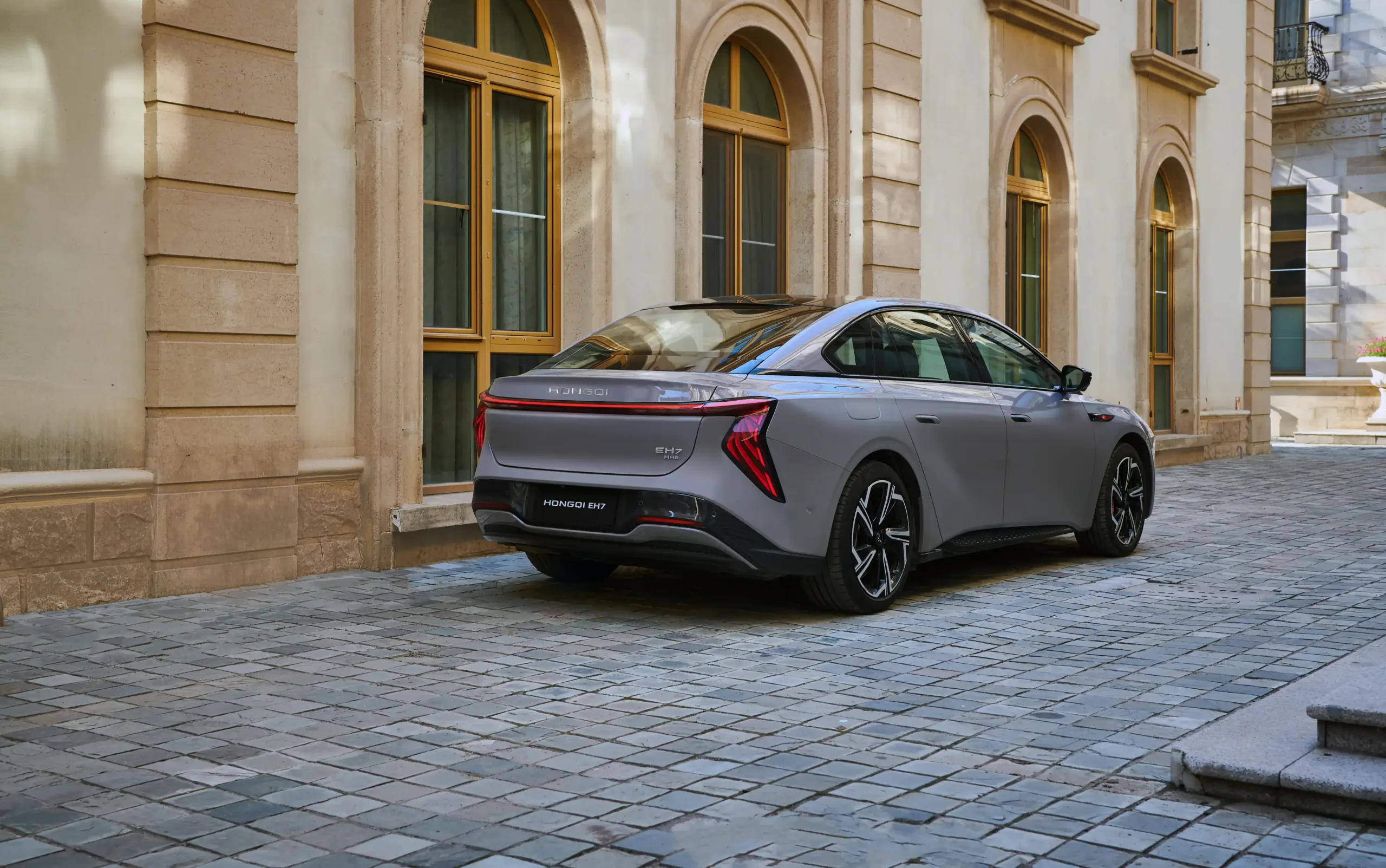Hongqi EH7 představuje nový designový jazyk značky určený pro elektrická vozidla. Elegantní uzavřená přední maska je doplněna Full LED světlomety, které propojují horizontální i vertikální linie a dodávají vozu moderní a nadčasový vzhled. Sportovní charakter vozu podtrhuje široká spodní mřížka. Plynule se svažující střecha ve stylu kupé a zapuštěné kliky dveří zajišťují aerodynamický profil karoserie. Zadní část pak zdobí výrazné vertikální LED světla, propojená tenkým světelným pásem, který umocňuje elegantní a dynamický vzhled vozu.